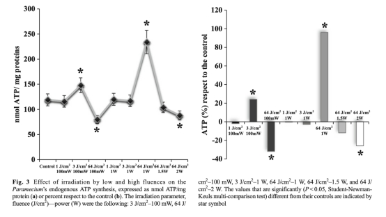 2 ATP合成數據:研究測量了草履蟲的內源性ATP合成水平,數據來自Fig.3。結果顯示,3 J/cm2-100 mW和64 J/cm2-1 W照射顯著增加ATP合成,而64 J/cm2-100 mW和64 J/cm2-2 W抑制ATP合成。研究意義在于,ATP數據與氧消耗一致,表明激光調制線粒體活動未導致呼吸鏈解偶聯,從而驗證了光生物調制的安全性,并為高能量密度療法提供實驗依據,可能應用于增強細胞能量代謝。