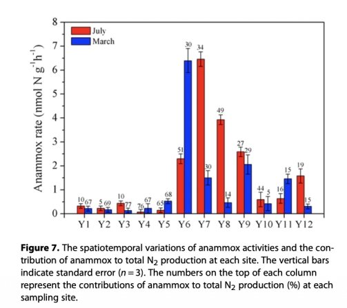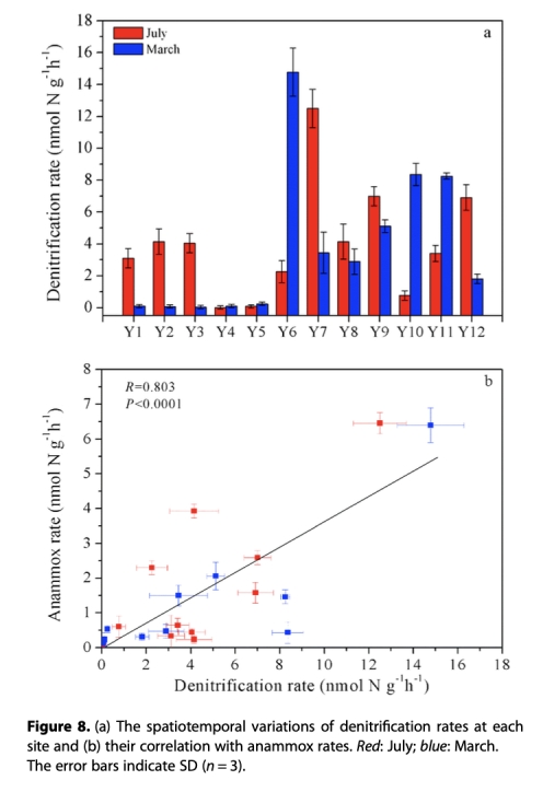4. 反硝化速率數(shù)據(jù):來(lái)自同位素示蹤,數(shù)據(jù)體現(xiàn)在圖8。研究意義是比較anammox與反硝化的關(guān)系,顯示兩者活性正相關(guān),支持anammox和反硝化可能耦合的假設(shè)。