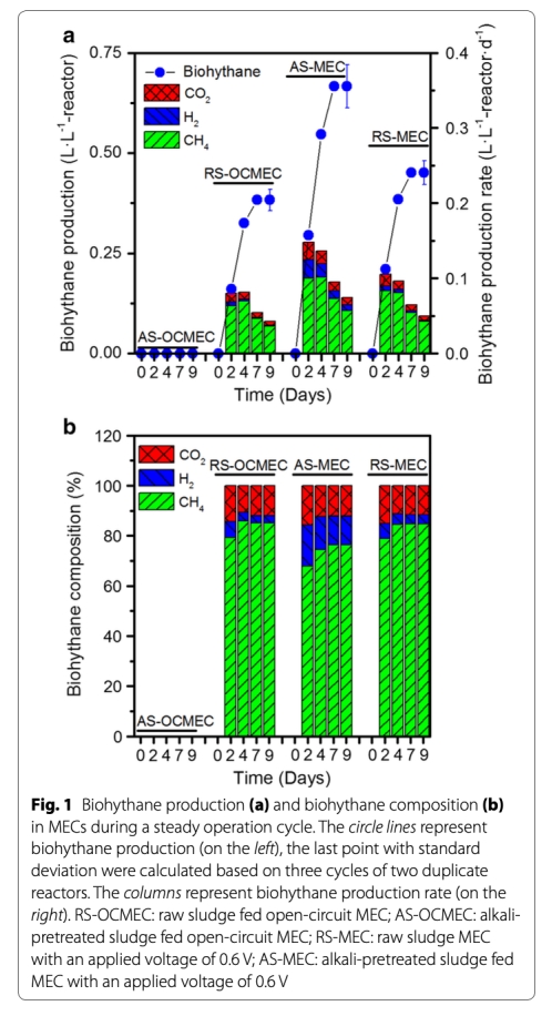 1 生物氫烷產率和氣體組成數據:來自圖1,顯示AS-MEC產率最高,氫氣和甲烷比例分別為11.3%和67.8%。研究意義是證實堿預處理和MEC協同增強污泥水解和生物氫烷生產,為優化燃料混合比提供依據,表明MEC技術在實際廢物處理中的高效性。
