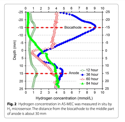 2 氫氣濃度原位測量數據:來自圖2,使用氫氣微傳感器顯示陰極附近氫氣濃度在36小時達峰值9 mmol/L,隨后下降。研究意義是直接驗證陰極氫氣生產和氫營養型甲烷菌的消耗,揭示MEC中氫氣動態平衡,為理解氣體轉化路徑提供實時證據。