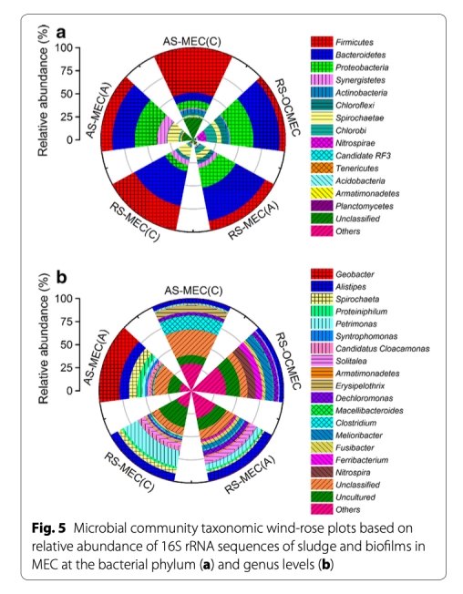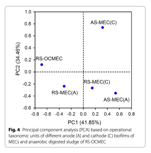 4 微生物群落結構數據:來自圖4、5、6,通過PCA和分類柱狀圖顯示AS-MEC陽極以Geobacter為主,陰極以Clostridium為主,古菌以Methanobacterium為主。研究意義是揭示功能菌群富集和協同網絡,如產電菌與氫營養型甲烷菌合作,推動多級底物利用,為設計高效合成群落提供基礎。