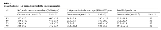 3 測量了N2O在污泥聚集體內外層的產生量量化。數據來自表1,顯示在pH 8.0和8.5時,N2O主要產生于外層(占比約60%),而在pH 7.0和7.5時,內層產生占比增至約68%。研究意義在于證實pH變化會改變N2O產生的主導途徑,低pH促進反硝化途徑的N2O積累,強調pH控制對途徑調控的重要性。