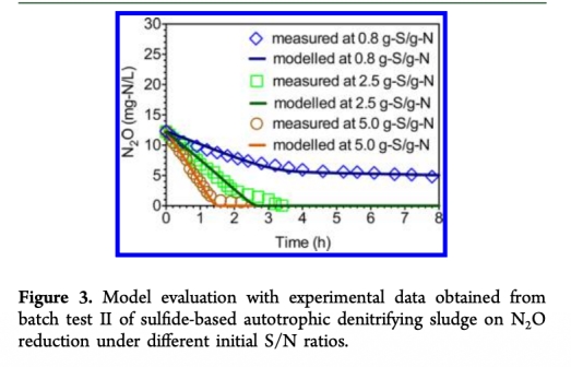 2. 數據來自圖3:測量了硫化物基AD過程中不同初始S/N比(0.8、2.5和5.0)下的N2O還原動態。這些數據用于模型驗證,研究意義是顯示S/N比對N2O還原的影響,表明較高S/N比促進N2O還原,有助于優化操作條件以減少N2O排放。
