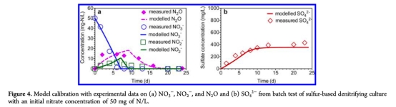 3. 數據來自圖4和圖5:測量了硫基AD過程中的硝酸鹽(NO3-)、亞硝酸鹽(NO2-)、氧化亞氮(N2O)和硫酸鹽(SO42-)的動態變化,用于模型校準和驗證。研究意義是證實模型適用于硫基AD系統,揭示N2O積累模式,并支持模型在不同條件下的適用性。