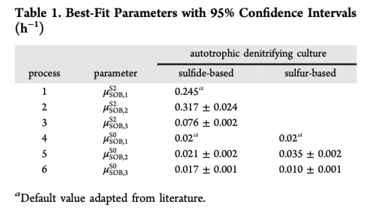 4. 數據來自表1:提供了最佳擬合參數值,如最大反應率(μSOB,2、μSOB,3等),用于模型校準。研究意義是獲得關鍵動力學參數,增強模型可靠性,并揭示硫化物基和硫基AD過程的速率差異,反映微生物群落的影響。