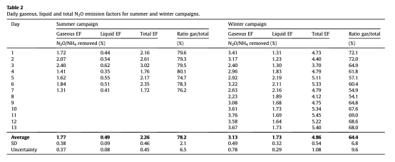 2 數(shù)據(jù)來自表2:提供了每日氣體、液體和總N2O排放因子,顯示夏季平均排放因子為2.26%±0.46%(以去除的銨計),冬季為4.86%±0.54%。研究意義是這些數(shù)據(jù)量化了N2O排放的規(guī)模,突出季節(jié)性差異,并強調(diào)溶解N2O通量在總排放中的貢獻,為減排策略提供依據(jù)。