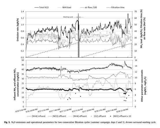 3 數(shù)據(jù)來自圖5:測量了過濾周期內(nèi)N2O排放和操作參數(shù)(如銨濃度、曝氣流量)的變化。研究意義是顯示N2O排放隨過濾時間增加,表明生物膜擴展可能促進排放,為優(yōu)化反沖洗頻率提供見解。