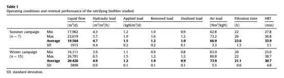 5 數(shù)據(jù)來自表1:總結(jié)了操作條件(如液體流量、水力負載、銨負載)和去除性能。研究意義是這些數(shù)據(jù)表征了生物濾池的運行狀態(tài),顯示冬季負載略低但性能相似,為N2O排放分析提供背景。