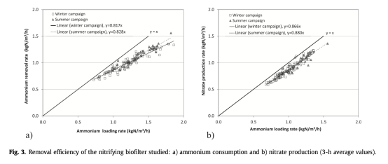 6 數(shù)據(jù)來自圖3:測量了銨消耗和硝酸鹽生產(chǎn)的去除效率,平均銨去除率約83%。研究意義是確認生物濾池的高效硝化能力,支持N2O排放與過程性能的關(guān)聯(lián)分析。