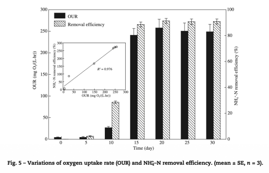 3 氧氣攝取率(OUR)數據:來自圖3和5,顯示顆粒OUR從初始4.11-26.62 mg O2/(L·hr)升至240.83±15.59 mg O2/(L·hr),且與NH4-N去除效率顯著正相關(R2=0.976)。研究意義是量化微生物代謝活性,證明氧氣消耗主要源于硝化過程,OUR可作為硝化效能的指標。