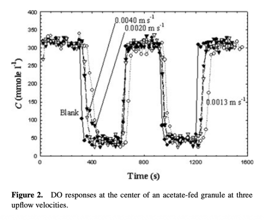1 測量了不同流速下顆粒中心DO的瞬態響應曲線,用于確定最小化外部傳質阻力的臨界流速。數據來自圖2,顯示流速高于0.002 m/s時外部阻力可忽略。