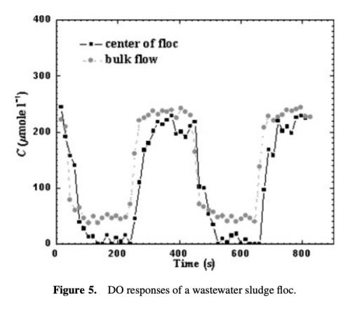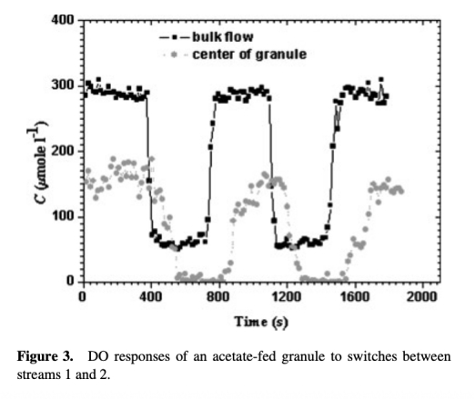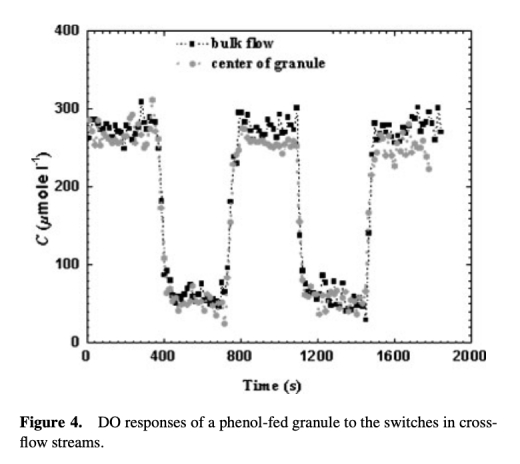 研究思路包括培養兩種好氧顆粒(乙酸酯和苯酚作為碳源),使用丹麥Unisense微電極動態測量顆粒中心DO對液相DO階躍變化的響應。通過設計流動腔室控制高流速以忽略外部傳質阻力,應用一維瞬態擴散模型計算表觀氧擴散系數。結合顆粒特性分析(尺寸、ECP含量等)和共聚焦顯微鏡成像,關聯擴散性與顆粒結構和組成。