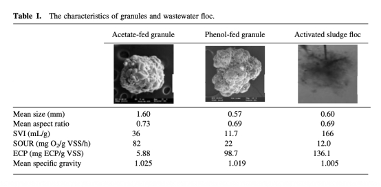 3 測量了顆粒的物理化學特性,包括平均尺寸、縱橫比、污泥體積指數(SVI)、比耗氧速率(SOUR)、ECP含量和平均比重。數據來自表1。