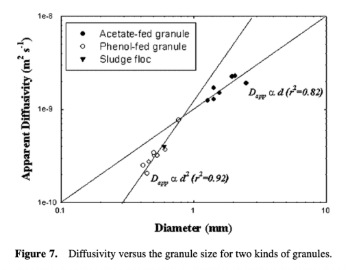 3 擴散性與顆粒尺寸存在相關性:乙酸酯喂養顆粒呈線性關系(Dapp ∝ d),苯酚喂養顆粒呈平方關系(Dapp ∝ d2),表明顆粒內部結構(如孔隙大小)是影響擴散性的關鍵因素。
