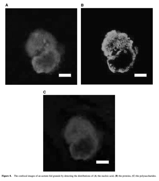 6 通過共聚焦激光掃描顯微鏡(CLSM)觀察顆粒內部核酸、蛋白質和多糖的分布。數據來自圖8,顯示顆粒內部存在大孔隙和通道。