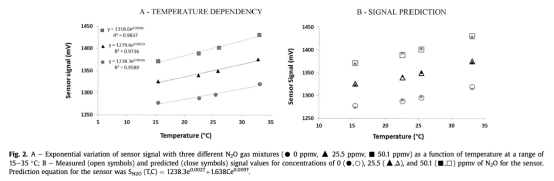 2 數據來自圖2和溫度測試:測量了傳感器信號在15-33°C溫度范圍內的指數依賴性,使用雙指數方程擬合(如S_N2O(T,C)=1238.3e^(0.002T) + 1.638Ce^(0.009T))。研究意義是溫度補償模型僅需6個校準點即可準確預測信號,最大誤差3.0%,使傳感器適用于全規模廠的溫度波動環境,提高數據可靠性。