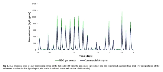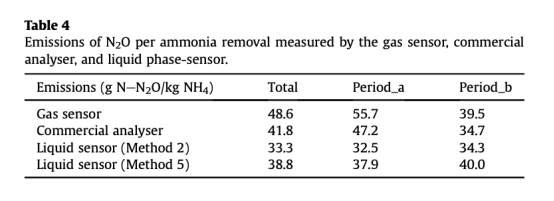 3 數據來自圖3和表2:測量了全規模SBR在4天監測期內氣相N2O排放動態,比較氣體傳感器和商業分析儀的結果。總排放量氣體傳感器為19.69 kg N-N2O,商業分析儀為16.91 kg N-N2O,差異14.1%。研究意義是傳感器在高濃度峰值(>500 ppmv)時更準確,商業分析儀飽和導致低估,突出傳感器在捕捉峰值排放方面的優勢,對準確評估溫室氣體排放因子至關重要。