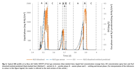 4 數據來自表3和圖4:測量了基于溶解N2O傳感器數據使用五種方法估算的排放量,與方法5(結合OTR和動態KLa估算)的預測值與氣體傳感器測量值吻合度達98.7%。研究意義是驗證了溶解N2O測量可可靠估算氣體排放,簡化監測設置;好氧階段貢獻總排放的96.1%,強調好氧過程的主導作用。