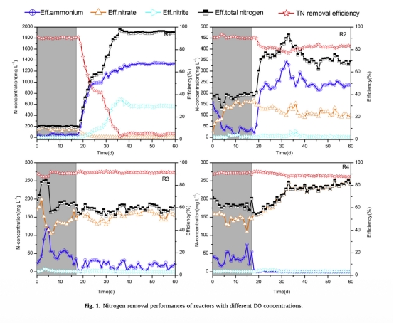 1. 數據來自圖1:測量了不同DO濃度(1.0、2.0、2.7和3.5 mg/L)下的總氮去除效率(TNRE)和氨氮去除效率(ARE)。研究意義是顯示DO對氮去除效率的顯著影響,最佳DO為2.7 mg/L時TNRE超過90%,幫助識別最優操作條件,避免DO過低或過高導致的效率下降。