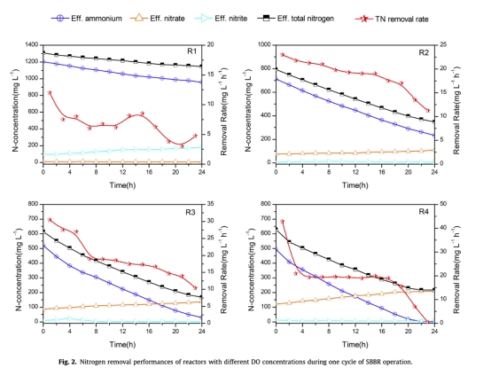 2. 數據來自圖2:測量了一個操作周期內氮濃度(氨氮、亞硝酸鹽、硝酸鹽)的動態變化。研究意義是揭示SNAP系統的瞬時去除過程,顯示部分亞硝化和厭氧氨氧化的協同作用,強調DO控制對維持反應平衡的重要性。