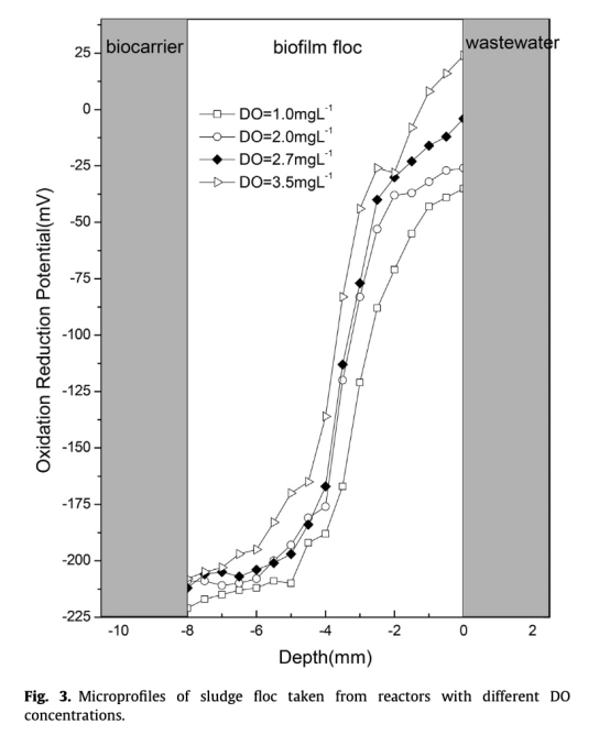 3. 數據來自圖3:使用微電極測量了生物膜內部的ORP剖面,顯示不同DO濃度下的氧化還原梯度。研究意義是直接可視化生物膜微環境,證實外部好氧區和內部厭氧區的存在,支持氨氧化細菌(AOB)和厭氧氨氧化細菌(AAOB)的共存,為優化DO提供機理依據。
