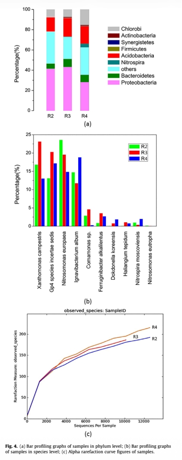 4. 數據來自圖4:通過16S rRNA測序分析了微生物群落在門水平和種水平的組成,如Proteobacteria、Xanthomonas campestris和Nitrosomonas europaea的相對豐度。研究意義是顯示DO如何影響優勢菌群比例,例如在DO為2.7 mg/L時AOB與AAOB比例約為4:7,揭示微生物群落結構與性能的關聯,并解釋難降解有機物去除的可能機制。