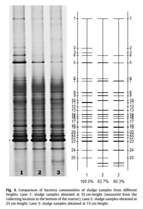 5. 數據來自圖5:通過DGGE分析了反應器不同高度(15cm、25cm、35cm)的微生物群落圖譜。研究意義是顯示盡管優勢菌群相似,但存在小范圍差異,表明DO梯度導致微環境變化,影響微生物分布,強調反應器內部均勻性對系統穩定性的重要性。