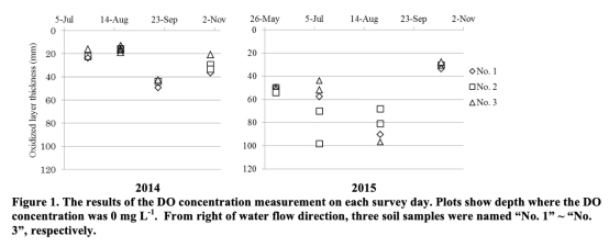 本研究回顧了自然條件下氧化還原層的特征,并于2014年至2015年進(jìn)行了田間調(diào)查。調(diào)查在稻田中進(jìn)行,測(cè)量了土壤溫度、氣溫和水中的總氮濃度。使用特殊的溶解氧濃度傳感器,以每0.2毫米的精度測(cè)量了淹水土壤中從表層至6厘米深度的氧化還原層的溶解氧濃度。根據(jù)溶解氧濃度結(jié)果,采集了濃度高于1 mg L-1的氧化層土壤和濃度低于0 mg L-1的還原層土壤。采用乙炔阻斷技術(shù)測(cè)量了各氧化還原層的反硝化活性。研究發(fā)現(xiàn),稻田土壤中的溶解氧濃度存在季節(jié)性變化,且變化發(fā)生在薄層中。在12~24°C范圍內(nèi),氧化層厚度與土壤表層溫度呈正相關(guān)。氧化層的反硝化活性很小,稻田的反硝化作用主要依賴于還原層。