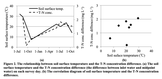 2. 水溫、總氮濃度差與土壤表層溫度的關(guān)系數(shù)據(jù):數(shù)據(jù)來自圖2。研究意義在于發(fā)現(xiàn)土壤表層溫度升高時(shí),進(jìn)水口與中點(diǎn)之間的總氮濃度差增大,這表明氮素去除效率與溫度呈正相關(guān),為理解溫度驅(qū)動(dòng)稻田氮素循環(huán)提供了證據(jù)。