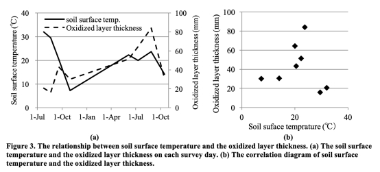 3. 氧化層厚度與土壤表層溫度的關(guān)系數(shù)據(jù):數(shù)據(jù)來自圖3。研究意義在于明確量化了在12~24°C范圍內(nèi),氧化層厚度隨土壤表層溫度升高而增加的正相關(guān)關(guān)系。這表明溫度是控制氧化層發(fā)育的關(guān)鍵環(huán)境因子。