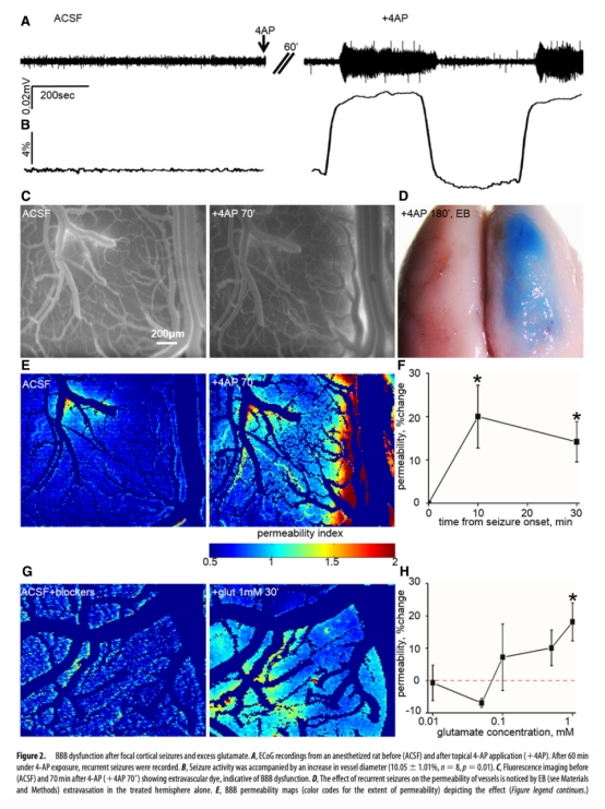 使用丹麥Unisense微電極測量組織氧分壓的數(shù)據(jù)(文中提及但未在提供的圖例中顯示具體圖表,其描述位于“Results”部分“Seizures result in BBB opening”中)顯示,在癲癇發(fā)作初期,腦組織氧分壓有短暫輕度下降,但因神經(jīng)血管耦合引起的血管擴張(圖2B所示),氧分壓迅速回升并超過基線水平,隨后在發(fā)作終止后逐漸恢復(fù)正常。這一測量的研究意義在于:它直接排除了組織缺氧是癲癇活動中觀察到的BBB快速開放(約10分鐘內(nèi))的主要原因。研究意義在于為“谷氨酸-NMDA受體通路直接介導(dǎo)BBB開放”這一核心機制提供了關(guān)鍵的間接支持證據(jù),將BBB開放與神經(jīng)元興奮性而非繼發(fā)的缺血缺氧事件更直接地聯(lián)系起來,從而強化了研究結(jié)論的可靠性。這有助于澄清以往關(guān)于BBB開放機制的爭議,并將原因聚焦于神經(jīng)遞質(zhì)信號通路本身。