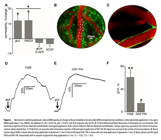3. 谷氨酸引起的血管周圍鈣離子和一氧化氮信號變化:數(shù)據(jù)來自圖3D-F。研究意義是探討下游信號通路。結(jié)果顯示谷氨酸應(yīng)用引起血管周圍鈣離子和NO水平顯著持續(xù)升高,意義在于提示鈣內(nèi)流和NO生成可能是谷氨酸-NMDA受體激活導(dǎo)致BBB開放的細胞內(nèi)信號事件。