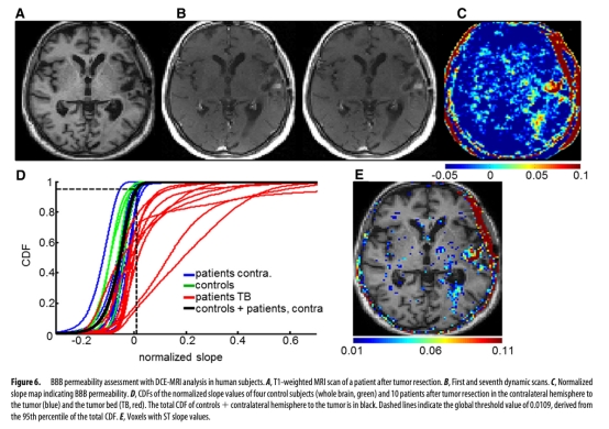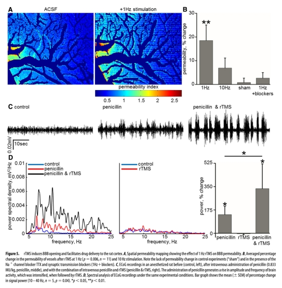 5. 經(jīng)顱磁刺激(TMS)對動物和患者BBB通透性及藥物遞送的影響:數(shù)據(jù)來自圖5(動物)和圖6、7(患者)。研究意義是探索非侵入性調(diào)控BBB的方法。結(jié)果顯示1Hz rTMS能顯著增加大鼠BBB通透性并促進青霉素腦內(nèi)遞送;dTMS能在多數(shù)患者中安全地增加腫瘤床及周邊腦區(qū)的BBB通透性,意義在于證明了TMS作為臨時打開BBB以增強化療遞送工具的可行性和轉(zhuǎn)化前景。
