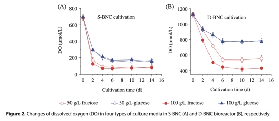 1 溶解氧(DO)變化:數(shù)據(jù)來自圖2,顯示培養(yǎng)過程中DO的消耗和平衡。研究意義在于揭示氧氣供應(yīng)對(duì)細(xì)菌代謝和BNC合成的影響,D-BNC生物反應(yīng)器由于雙氧供應(yīng),DO更高,促進(jìn)BNC產(chǎn)量。