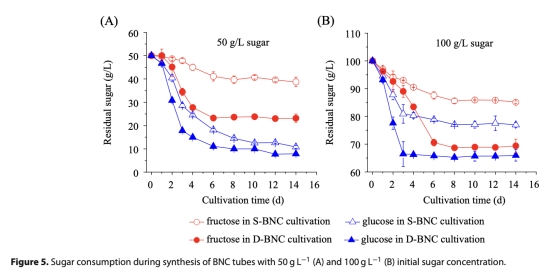 4 糖消耗:數(shù)據(jù)來自圖5,顯示培養(yǎng)過程中殘?zhí)菨舛茸兓Q芯恳饬x在于比較糖利用速率,葡萄糖消耗快于果糖,但果糖更利于BNC合成,D-BNC生物反應(yīng)器糖消耗更多,產(chǎn)量更高。