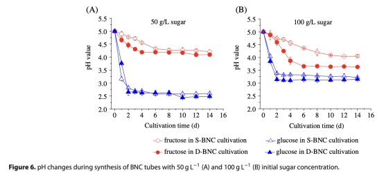 5 pH變化:數(shù)據(jù)來自圖6,顯示培養(yǎng)過程中pH下降。研究意義在于揭示代謝副產(chǎn)物酸的影響,葡萄糖導(dǎo)致pH更低,約束BNC合成,而果糖條件更溫和。