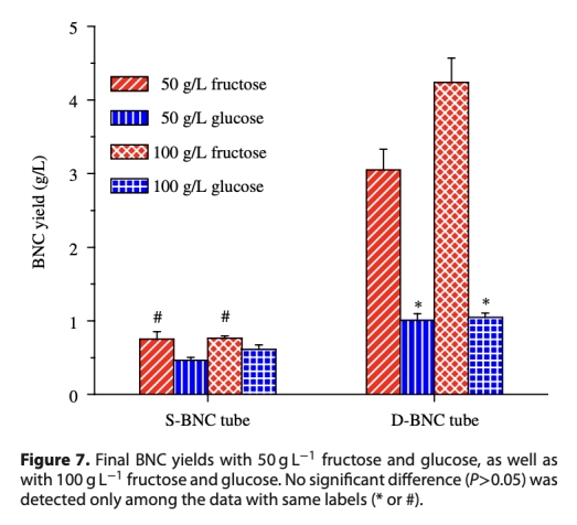 6 BNC產(chǎn)量:數(shù)據(jù)來自圖7,顯示最終BNC干重。研究意義在于評(píng)估不同條件下的產(chǎn)量,D-BNC生物反應(yīng)器產(chǎn)量更高,尤其使用高濃度果糖時(shí),達(dá)4.24 g/L。