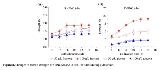 7 拉伸強(qiáng)度:數(shù)據(jù)來自圖8,顯示BNC管的軸向拉伸力。研究意義在于評(píng)估機(jī)械性能,隨時(shí)間增加,果糖條件強(qiáng)度更高,D-BNC管最強(qiáng)(18.04 N),適用于血管假體。