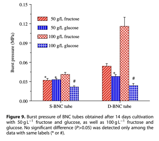 研究思路是通過使用Gluconacetobacter xylinus菌株,在兩種生物反應(yīng)器(D-BNC和S-BNC)中培養(yǎng)BNC管,使用不同濃度(50 g/L和100 g/L)的葡萄糖和果糖作為碳源。測(cè)量培養(yǎng)過程中的殘?zhí)菨舛取H變化、溶解氧(DO)、細(xì)菌分布、BNC產(chǎn)量,以及最終管的機(jī)械性能(拉伸強(qiáng)度、爆破壓力、水滲透性)和形態(tài)(FE-SEM)。通過對(duì)比分析,評(píng)估生物反應(yīng)器類型、糖類型和濃度對(duì)BNC管性質(zhì)的影響。