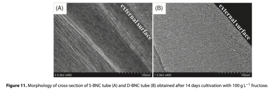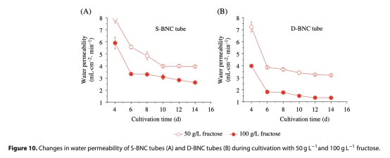摘要部分闡述了細(xì)菌納米纖維素(BNC)管在人工血管等醫(yī)療假體中的應(yīng)用前景。研究首次比較了兩種生物反應(yīng)器(雙硅膠管D-BNC和單硅膠管S-BNC)在合成BNC管時(shí)的差異,使用果糖或葡萄糖作為碳源。結(jié)果顯示,D-BNC生物反應(yīng)器由于氧氣供應(yīng)更好,產(chǎn)量更高,機(jī)械性能更優(yōu);高果糖濃度增加D-BNC產(chǎn)量,但對(duì)S-BNC影響小;果糖賦予更強(qiáng)機(jī)械性能但水滲透性較低。兩種管均由多孔納米纖維網(wǎng)絡(luò)組成,但橫截面形態(tài)和纖維分布不同。