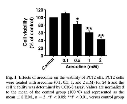 1 細胞活力測量(圖1):檳榔堿處理(0.5-2 mM)顯著降低PC12細胞活力。研究意義:直接證明檳榔堿的濃度依賴性神經毒性,為后續機制研究奠定基礎。