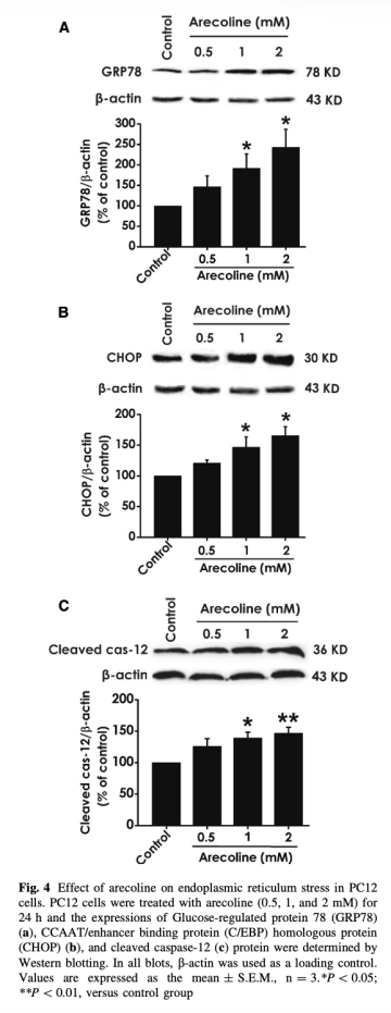 4 ER應激標志物測量(圖4):檳榔堿增加GRP78、CHOP和cleaved caspase-12蛋白表達。研究意義:揭示ER應激參與檳榔堿神經毒性,可能觸發凋亡通路。
