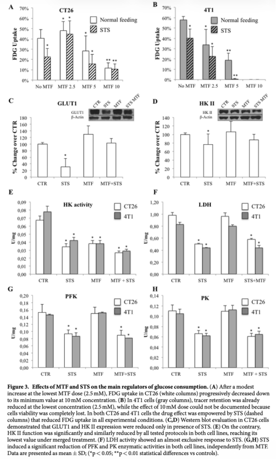 研究思路包括體內和體外實驗。在體內,使用小鼠模型(CT26結腸癌和4T1乳腺癌),通過成像研究(如微PET掃描)評估腫瘤生長和葡萄糖代謝變化。動物分為對照組、STS組、MTF組和聯合治療組,監測腫瘤體積、葡萄糖消耗率等。在體外,使用細胞培養(CT26、4T1細胞和人類成纖維細胞作為對照),通過測量FDG攝取、酶活性、ATP濃度、氧消耗率(OCR)、活性氧(ROS)等,評估二甲雙胍和饑餓對糖酵解和氧化磷酸化的影響。方法包括蛋白質組學、Western blot、酶活性測定、免疫熒光等,以闡明機制。