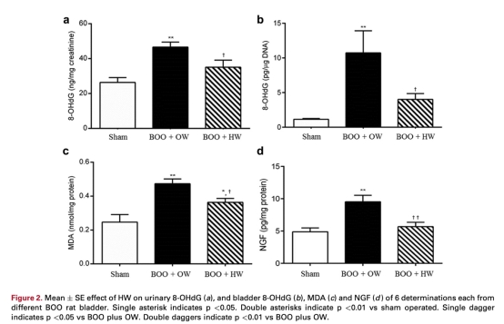 2 氫水降低氧化應(yīng)激標記物(8-OHdG和MDA)和NGF水平,但不影響膀胱肥大結(jié)構(gòu)變化。