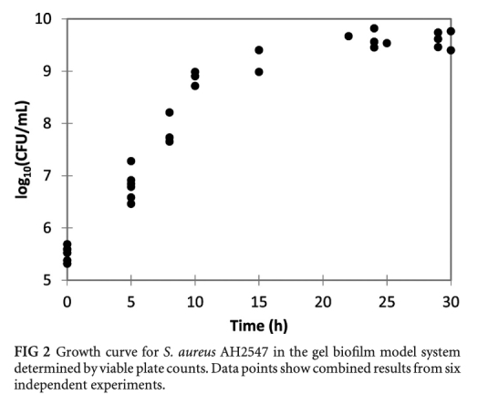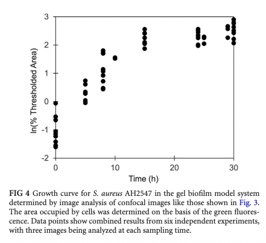 1 細(xì)菌生長(zhǎng)曲線數(shù)據(jù):通過活菌計(jì)數(shù)和圖像分析測(cè)量凝膠中金黃色葡萄球菌隨時(shí)間的變化。研究意義:顯示細(xì)菌在凝膠中初始快速生長(zhǎng)后速率降低,模擬體內(nèi)生物膜的慢生長(zhǎng)特性,與囊性纖維化痰液中的細(xì)菌生長(zhǎng)率相似。數(shù)據(jù)來(lái)自圖2和圖4。