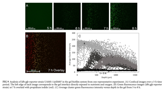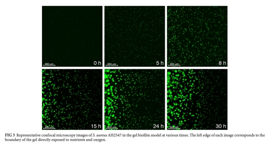 凝膠包埋的金黃色葡萄球菌作為生物膜感染模型表現(xiàn)出密集聚集體生長(zhǎng)、氧限制、抗生素耐受和異質(zhì)性基因表達(dá)