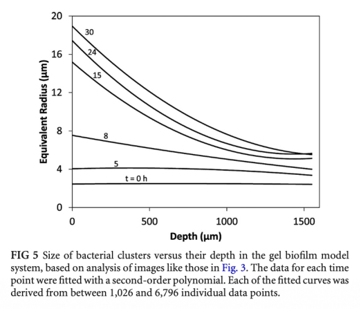 2 聚集體形態(tài)和大小梯度數(shù)據(jù):共聚焦顯微鏡圖像顯示細(xì)菌形成密集聚集體,且大小隨深度增加而減小。研究意義:證實(shí)模型再現(xiàn)了體內(nèi)生物膜的空間異質(zhì)性,聚集體大小梯度反映了營(yíng)養(yǎng)和氧的擴(kuò)散限制。數(shù)據(jù)來(lái)自圖3和圖5。