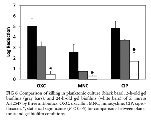 3 抗生素耐受性數(shù)據(jù):比較浮游細(xì)菌、2小時(shí)和24小時(shí)凝膠包埋細(xì)菌對(duì)苯唑西林、米諾環(huán)素和環(huán)丙沙星的殺傷效果。研究意義:凝膠包埋細(xì)菌表現(xiàn)出顯著抗生素耐受,耐受因子達(dá)2.8-10.5,模擬了生物膜感染的耐藥特性。數(shù)據(jù)來(lái)自圖6。