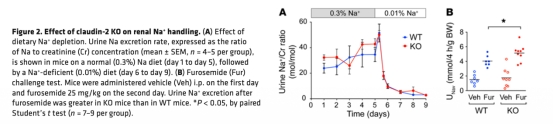 1 測量了鈉排泄率在正常和低鈉飲食下的變化,顯示KO小鼠鈉守恒能力與WT相同,即使在高鈉耗竭下也無差異(數據來自圖2)。研究意義是表明旁細胞運輸缺陷可被跨細胞機制補償,但可能帶來能量成本。