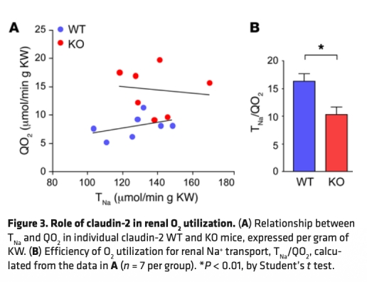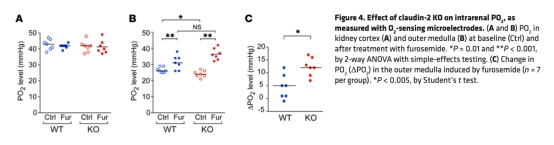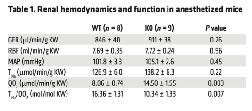 2 測量了全腎氧消耗(QO2)和鈉運輸(TNa)效率,KO小鼠QO2增加80%,TNa/QO2比率降低40%(數據來自表1和圖3)。研究意義是證明旁細胞運輸缺失導致氧利用效率下降,驗證了其節能作用。